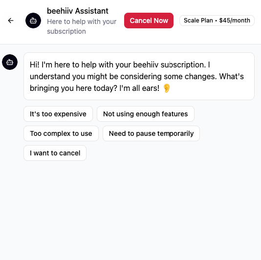 You can follow my conversation with Gemini in the following document: Cancellation process Beehiiv or try out a cancellation assistant that perhaps has more respect for what you set out to initially do.